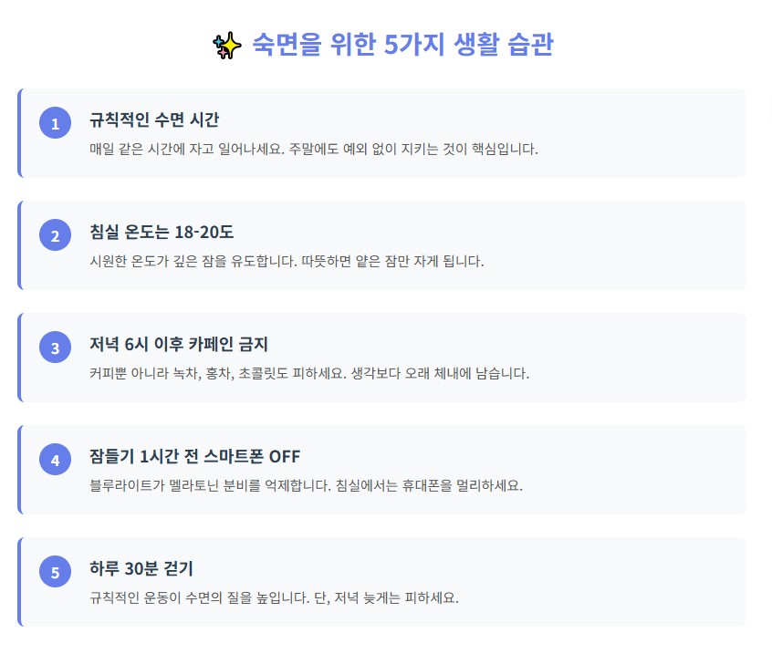 규칙적인 운동: 하루 30분 정도 걷기만 해도 수면의 질이 크게 개선됩니다. 단, 저녁 늦게 운동하면 오히려 잠을 방해하니 오후 4시 이전에 하세요.